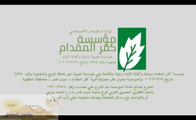 مؤسسة كفر المقدام مؤسسة خيرية لرعاية وكفالة الأيتام مشهرة برقم ٢٨٣٥ لسنة ٢٠٢١