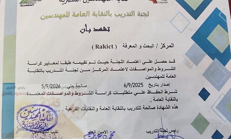 شركة “RAKICT” تحصل على اعتماد نقابة المهندسين المصرية كمركز تدريب معتمد في دورات التكنولوجيا الحديثة