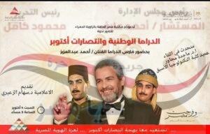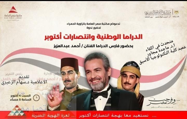 إحياءً لذكرى انتصارات السادس من أكتوبر المجيدة، أقامت مكتبة مصر العامة بالزاوية الحمراء ندوة بعنوان “الدراما الوطنية وانتصارات أكتوبر”، وذلك يوم السبت الموافق 4 أكتوبر في تمام الساعة الخامسة مساءً، بحضور النجم الكبير أحمد عبدالعزيز، وأدارت اللقاء الإعلامية القديرة د. سهام الزعيرى.