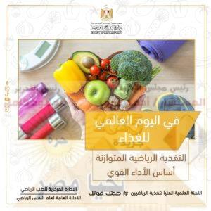 بمناسبة اليوم العالمي للغذاء الذي يوافق السادس عشر من أكتوبر من كل عام، تُنفذ وزارة الشباب والرياضة من خلال الإدارة المركزية للطب الرياضي – الإدارة العامة لعلم النفس الرياضي – واللجنة الطبية العليا لتغذية الرياضيين، حملة إعلامية متكاملة للتوعية بالتغذية الرياضية السليمة، وذلك في إطار حملة “صحتك قوتك” التي تنفذها الوزارة لرفع مستوى الوعي الصحي والطبي لدى الرياضيين والشباب.
