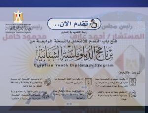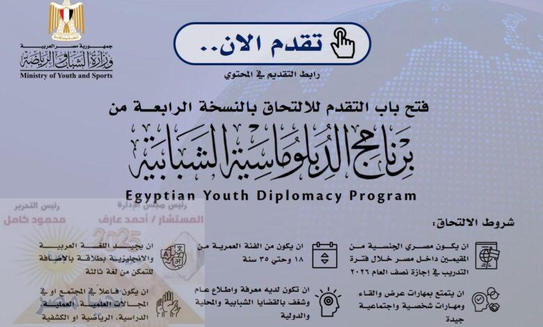 انطلاقاً من توجهات الدولة المصرية ودعماً لتنفيذ مستهدفات الاستراتيجية الوطنية للشباب والرياضة 2025–2030، وفي إطار تعزيز مفهوم الدبلوماسية الشبابية ودورها في تمكين الشباب المصري من التفاعل الفاعل على الساحة الدولية، تعلن وزارة الشباب والرياضة، بتوجيهات من الأستاذ الدكتور أشرف صبحي وزير الشباب والرياضة، عن فتح باب التقدم للدفعة الرابعة من برنامج الدبلوماسية الشبابية.