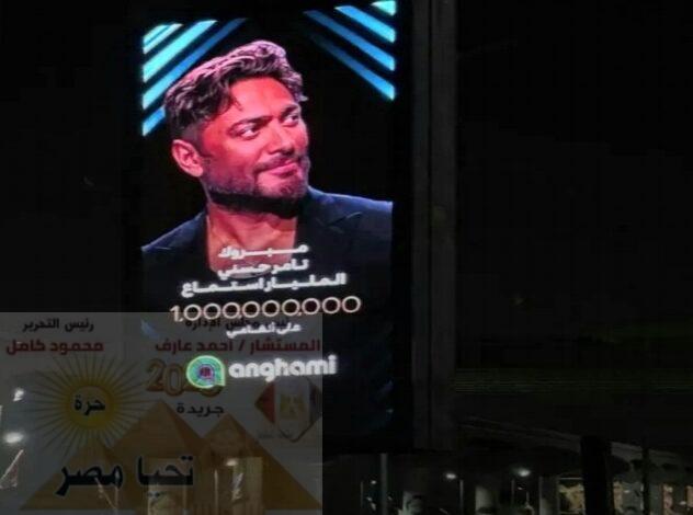 انتشرت لوحات اعلانية ضخمة في شوارع القاهرة احتفالاً بالنجم الفنان “تامر حسني” بعد تحقيق مجمل استماعاته على منصة أنغامي الى مليار استماع..