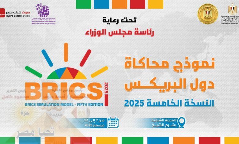 تستعد وزارة الشباب والرياضة، بالتعاون مع جمعية صوت شباب مصر، وتحت رعاية رئاسة مجلس الوزراء، لإطلاق فعاليات النسخة الخامسة من نموذج محاكاة دول البريكس 2025، والمقرر انطلاقها يوم الأحد المقبل بالمدينة الشبابية في شرم الشيخ، بمشاركة واسعة من الشباب من مختلف محافظات الجمهورية، من خلال الإدارة المركزية للتعليم المدني ـ الإدارة العامة لبرلمان الشباب والطلائع.