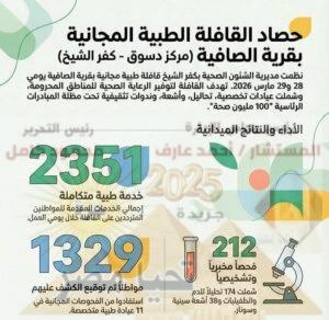 أوضح محافظ كفرالشيخ أن القافلة ضمت 11 عيادة طبية تخصصية شملت الباطنة، الأطفال، الجراحة العامة، الجلدية، النساء، تنظيم الأسرة، الأسنان، الأنف والأذن، العظام، والرمد، كما تم إجراء 174 تحليلًا طبيًا (معمل دم – معمل طفيليات)، و38 فحصًا بالأشعة (أشعة عادية – سونار)، إلى جانب تنفيذ ندوات للتثقيف الصحي تناولت التوعية بالأمراض المزمنة وطرق الوقاية منها، استفاد منها 690 مواطنًا.