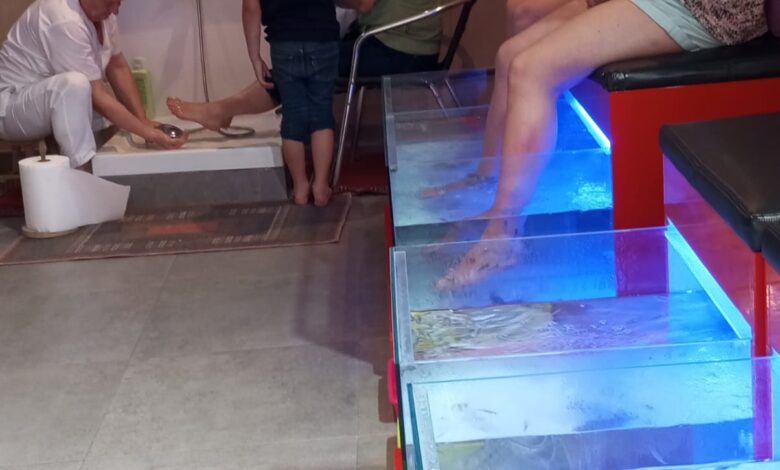 شاهدت اليوم احدث طريقة لعلاج القدمين من التقشف والكلو والجفاف والأمراض الأخرى ؛ بوضع القدمين فى حوض مياه زرقاء بلون البحر مليئة بالاسماك الملونة التى تقوم بأكل الزوائد من القدمين وتنظيفه وعلاجه من التقشف !!